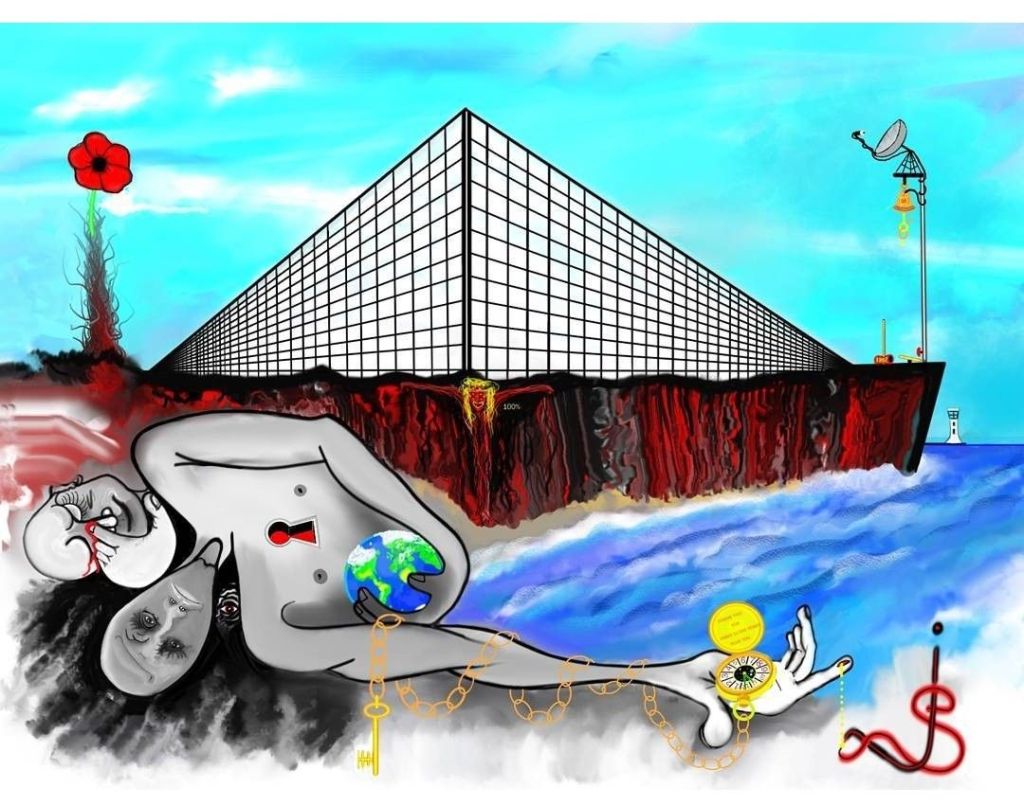 - Systemic Surveillance & Control: Represented by “Big Brother” figures, rigid architectural grids (the pyramid), and “secret coded files.”