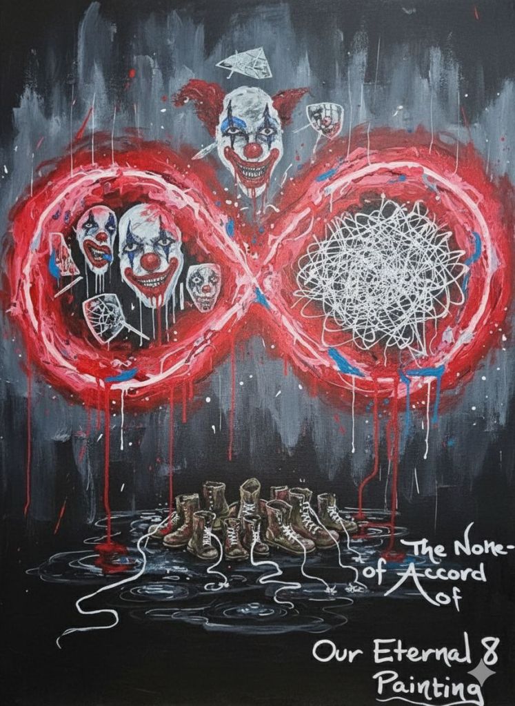 The “Eternal 8”: The swirling white lines create a circular, almost umbilical movement around the figures. This reflects your poem’s mention of the “eternal 8” (the infinity symbol \infty), hinting at a cycle of pain and performance that never truly ends.