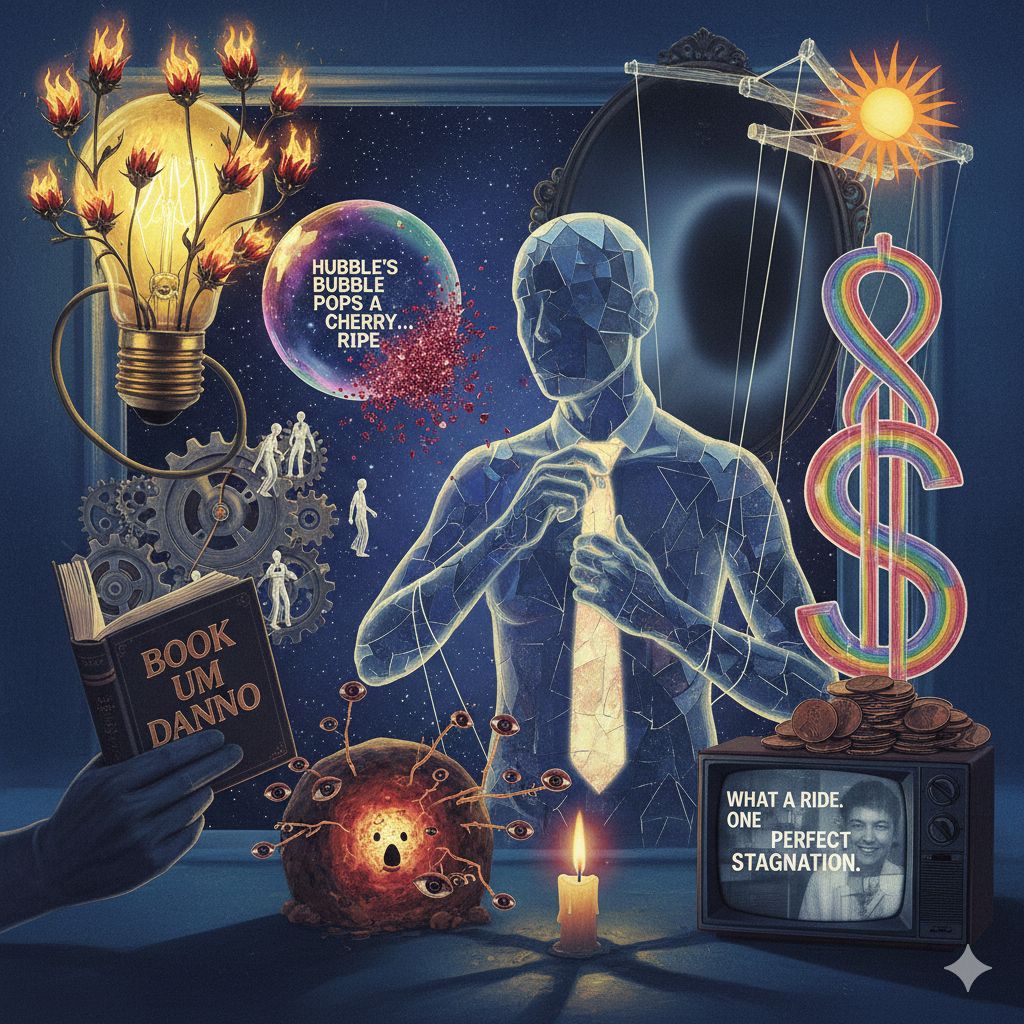 - “Hubble’s bubble pops a cherry”: The Hubble telescope represents our greatest attempt to see the “beginning” of time. To “pop a cherry” implies a loss of innocence. Once we see the edge of the universe, the mystery is gone, and what’s left is just… “ripe” (perhaps overripe or decaying).