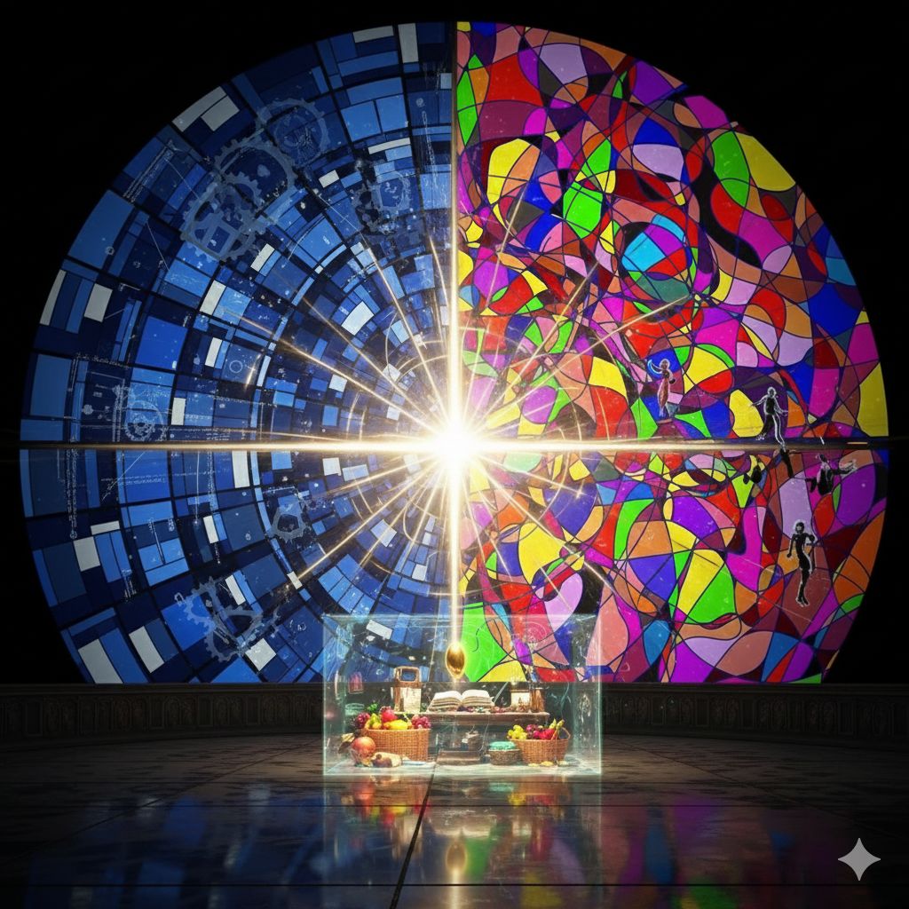 This work is a high-octane collision of architectural trauma and luminous rebirth. It is a “flamboyant” testament to the fact that while the past may be a jagged mosaic, the future is a sphere—infinite, contained, and rolling forward.