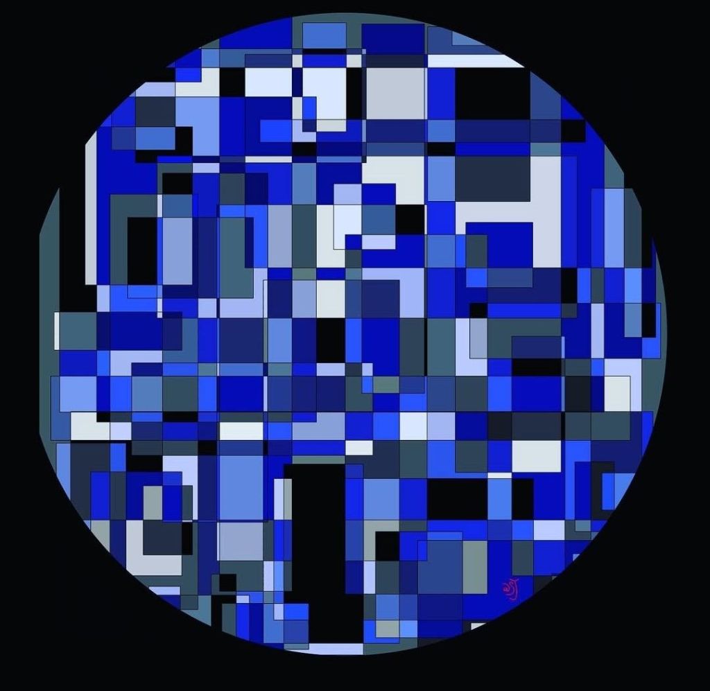 The visual component is a cybernetic stained-glass window. Contained within a perfect circle, we see a chaotic grid of rectangles—cobalt, cerulean, slate, and bone-white.